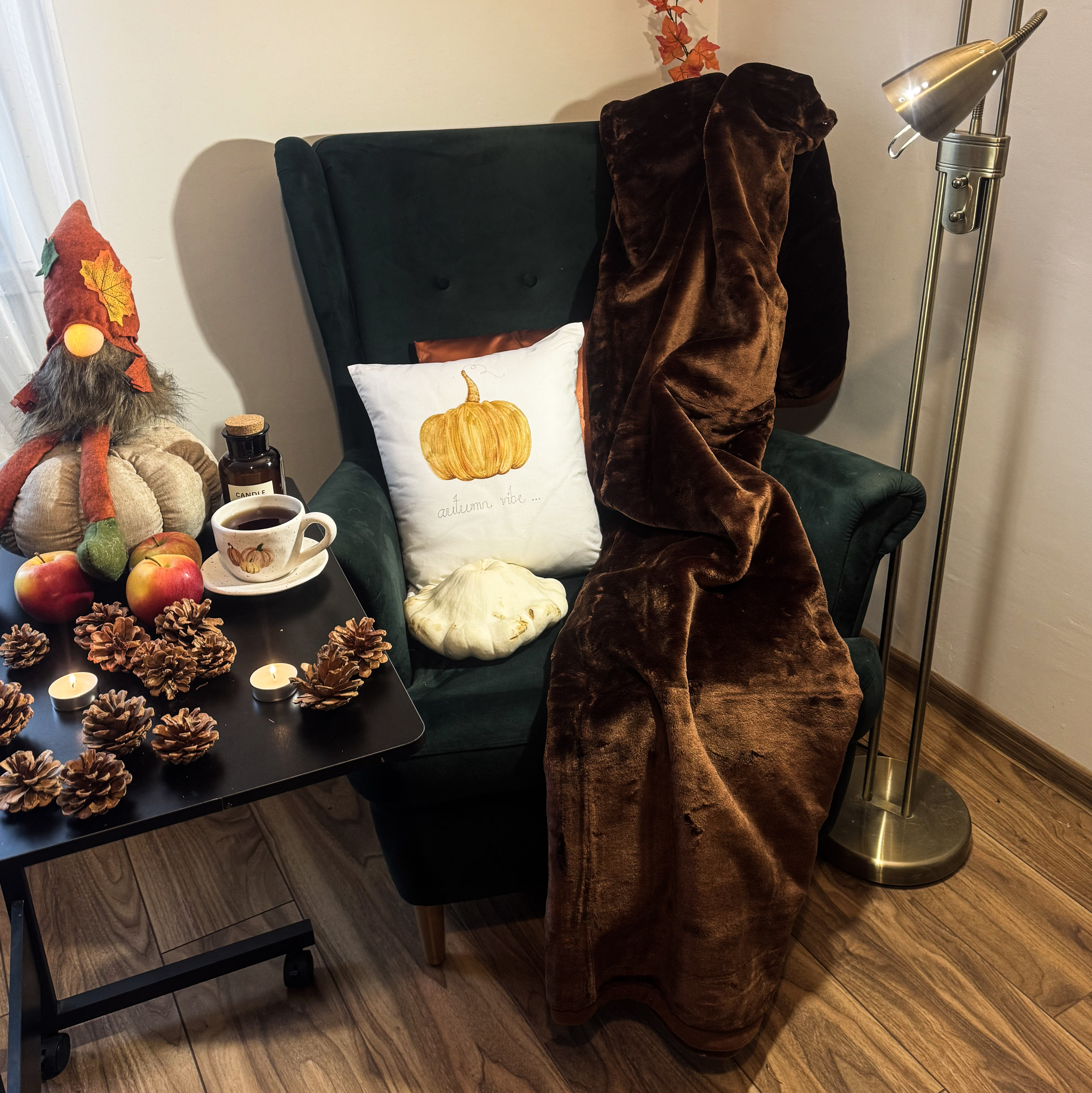 Koc akrylowy - Gruby i ciepły- Ciemno brązowy, koc rozłożony na fotelu w estetyczne fale, otoczony jesiennymi dodatkami