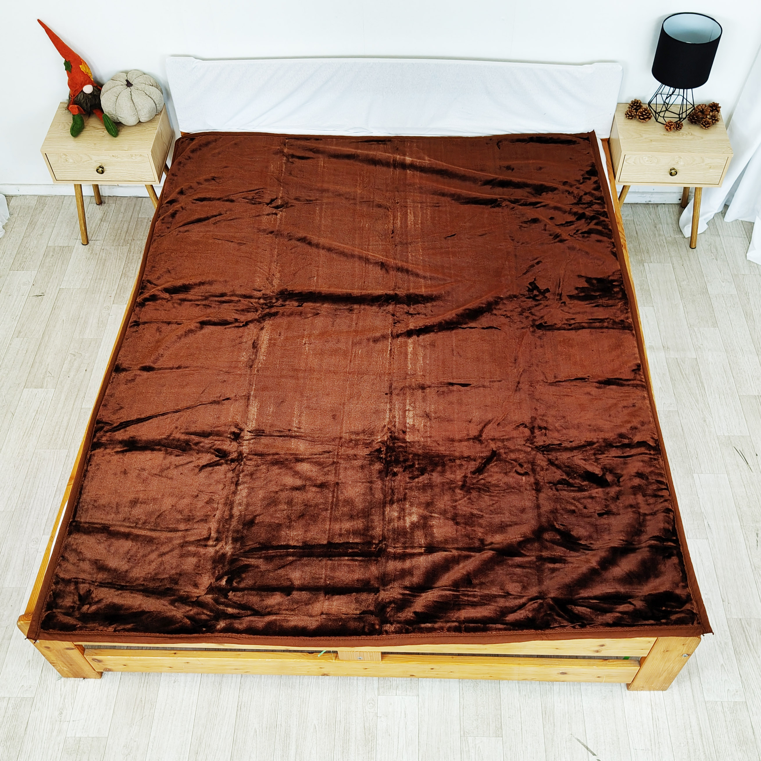 Koc akrylowy - Gruby i ciepły- Ciemno brązowy, koc rozłożony na łóżku