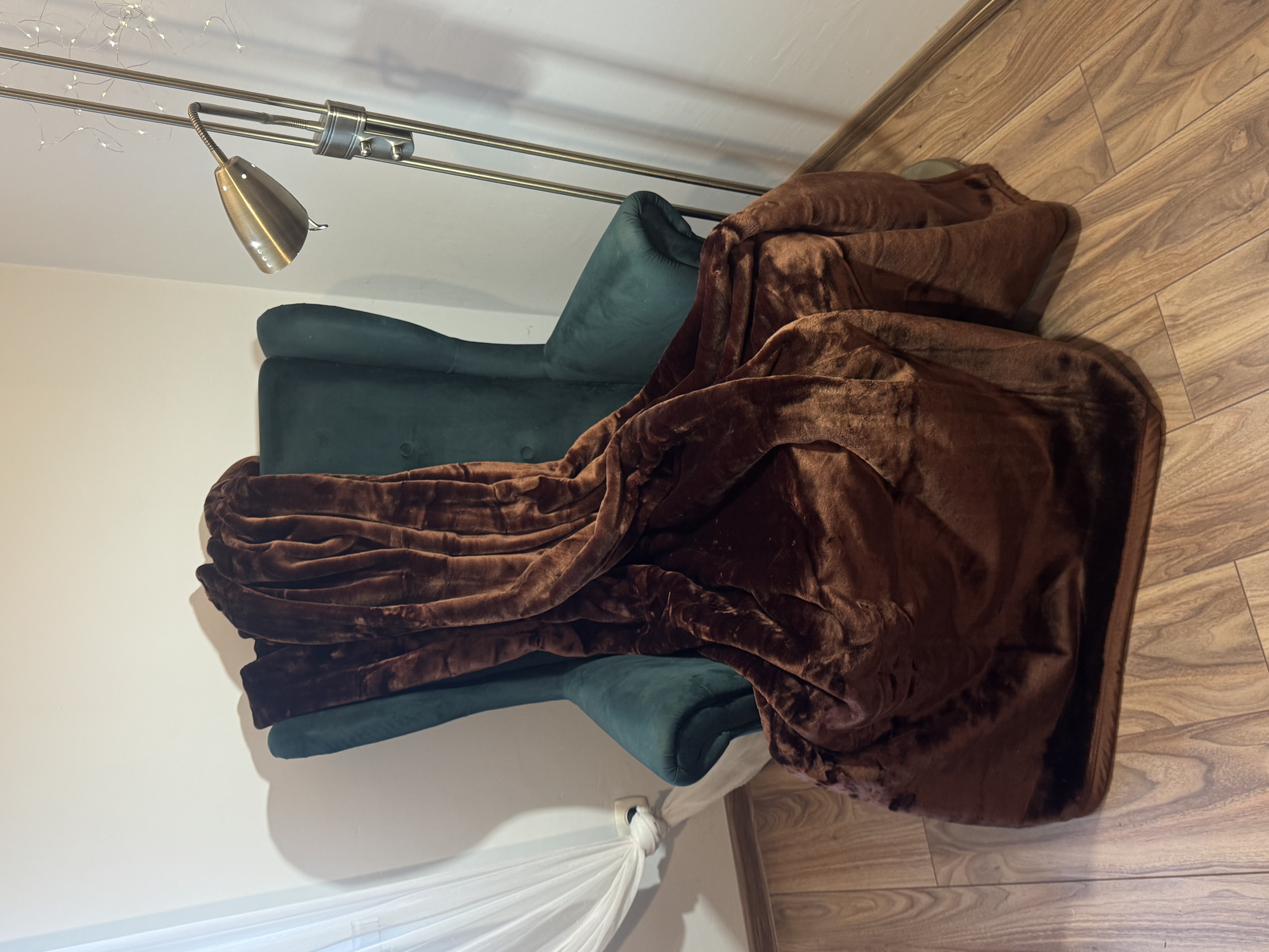 Koc akrylowy - Gruby i ciepły- Ciemno brązowy, koc rozłożony na fotelu w estetyczną fale