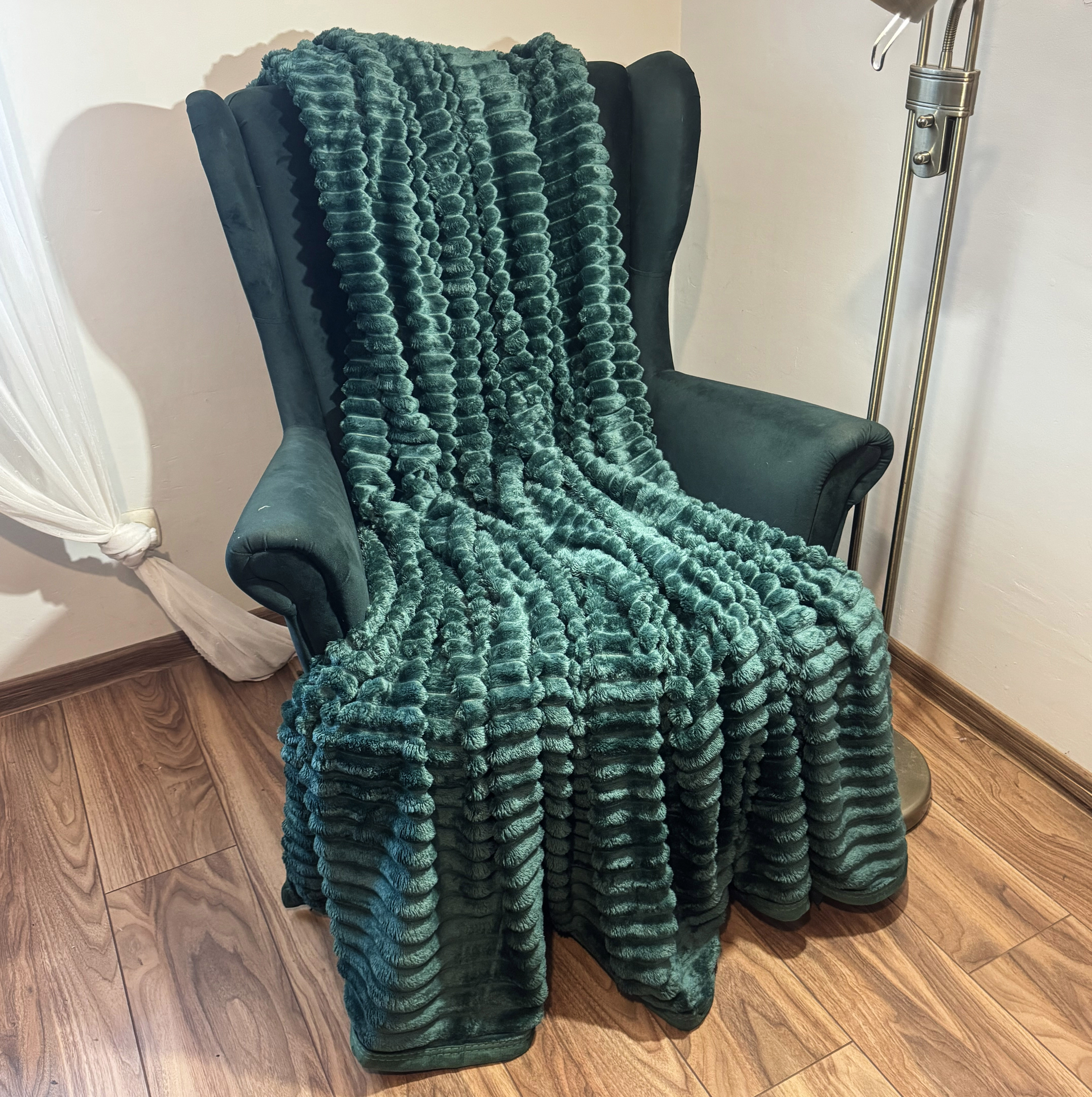 Koc z Mikrofibry Pluszowy tłoczony 200x220 - Zieleń butelkowa, koc rozłożony na fotelu w estetyczną fale