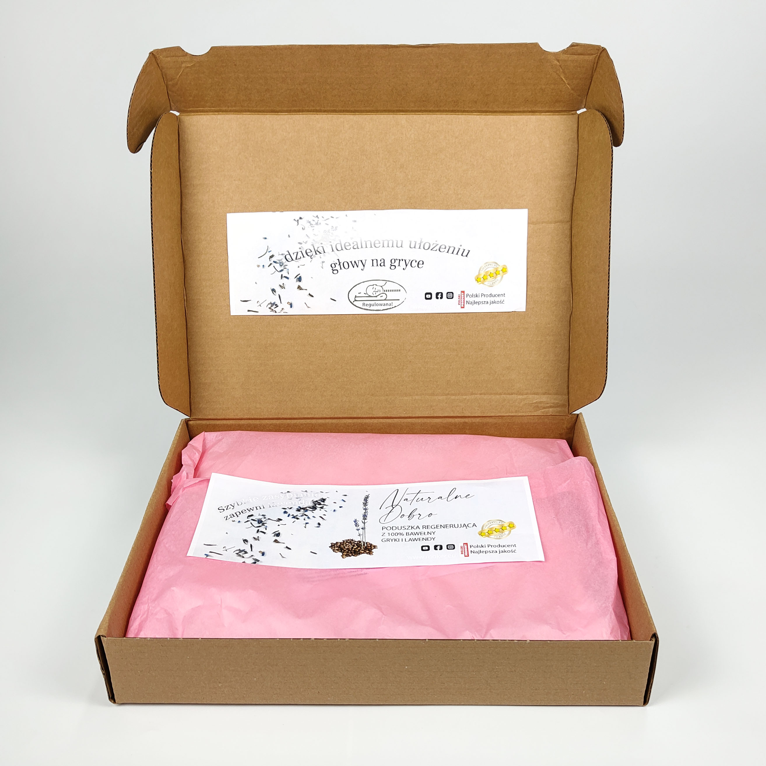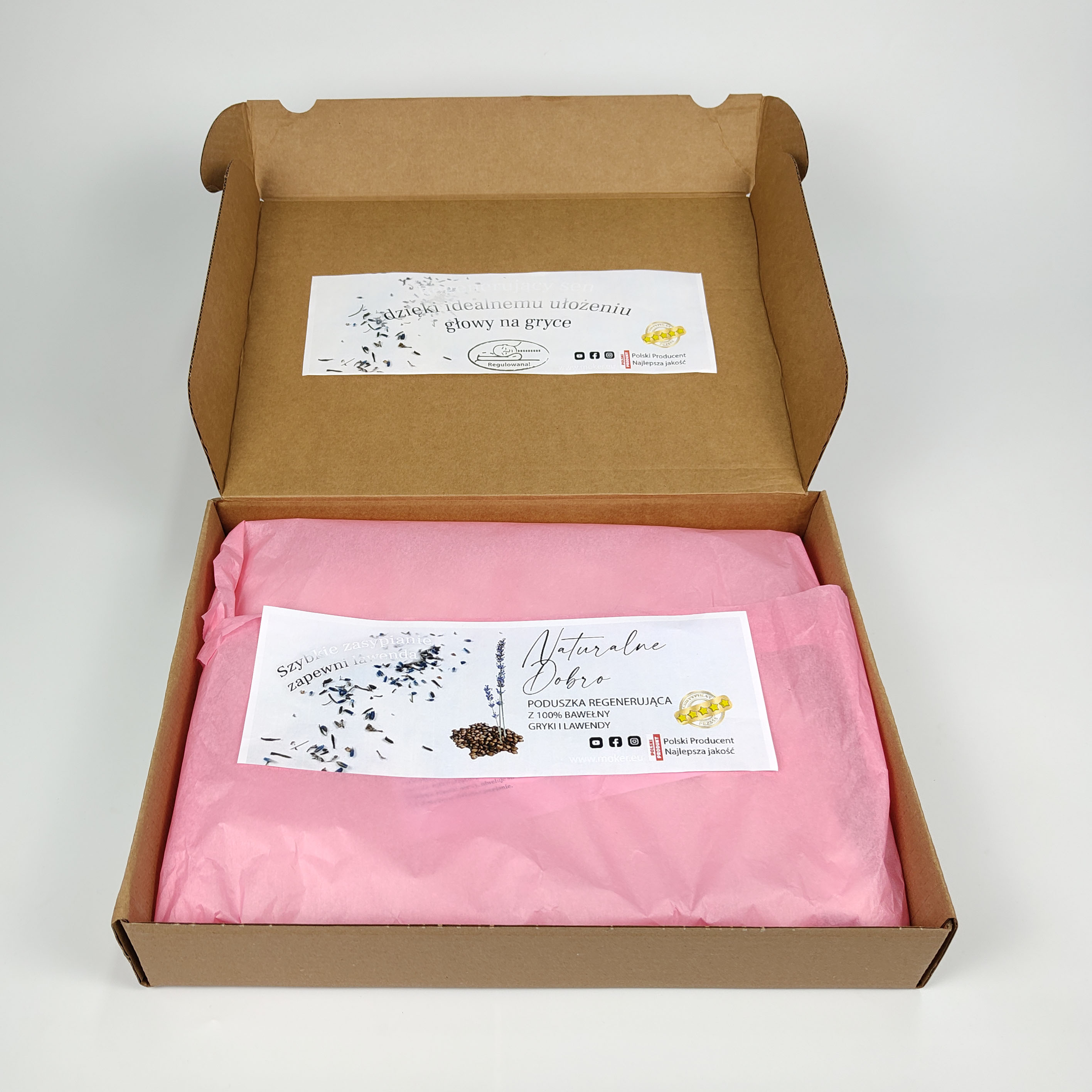 Poduszka zapakowana w ozdobne eco pudełko, przez co idealnie nadaje się na prezent.