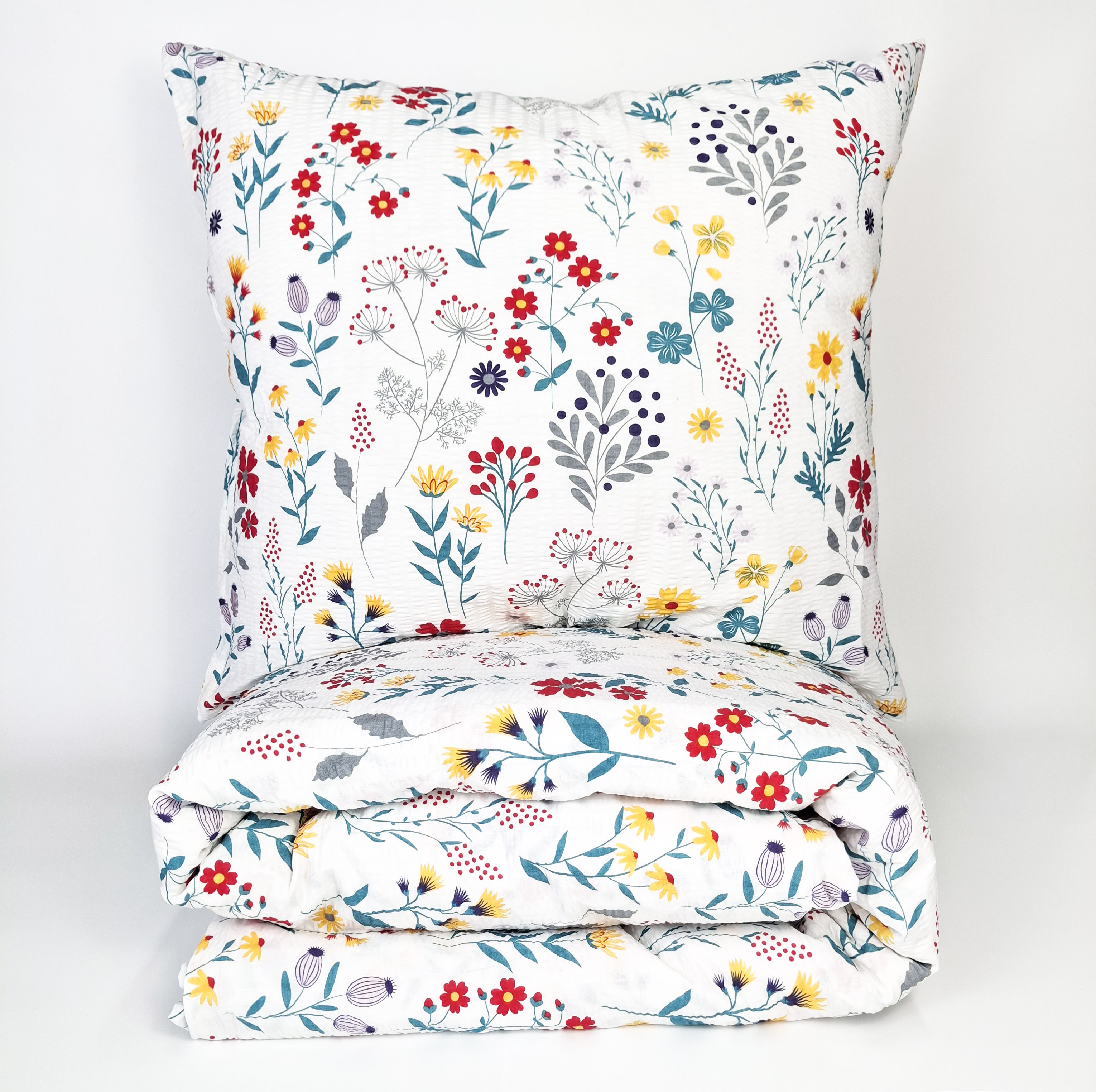 Pościel z Kory PREMIUM Lilia Wytrzymała- Kolorowa łąka na bieli  1345B, poskładana pościel i ubrana poduszka