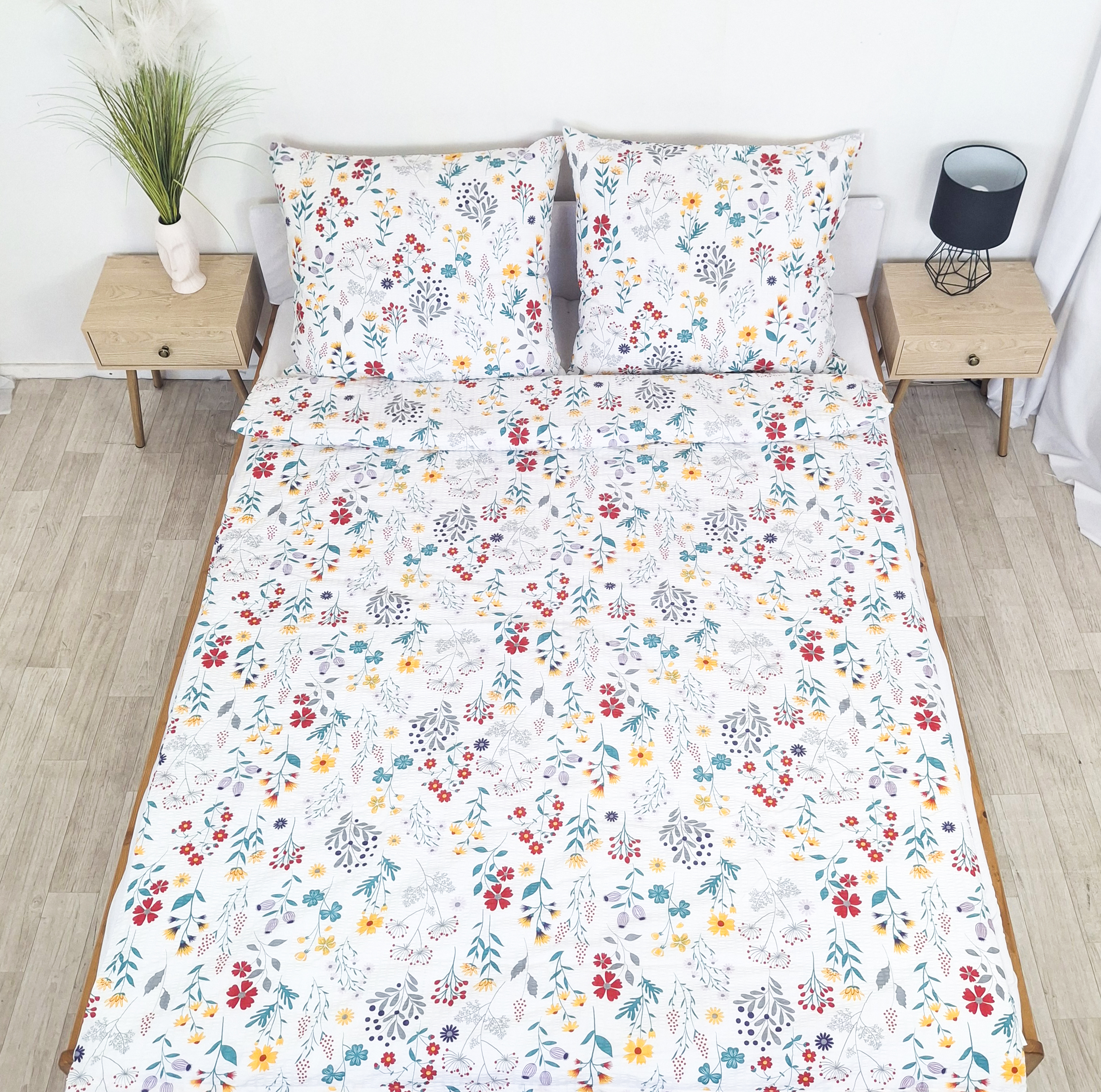 Pościel z Kory PREMIUM Lilia Wytrzymała- Kolorowa łąka na bieli 1345B, rozłożona na łóżku