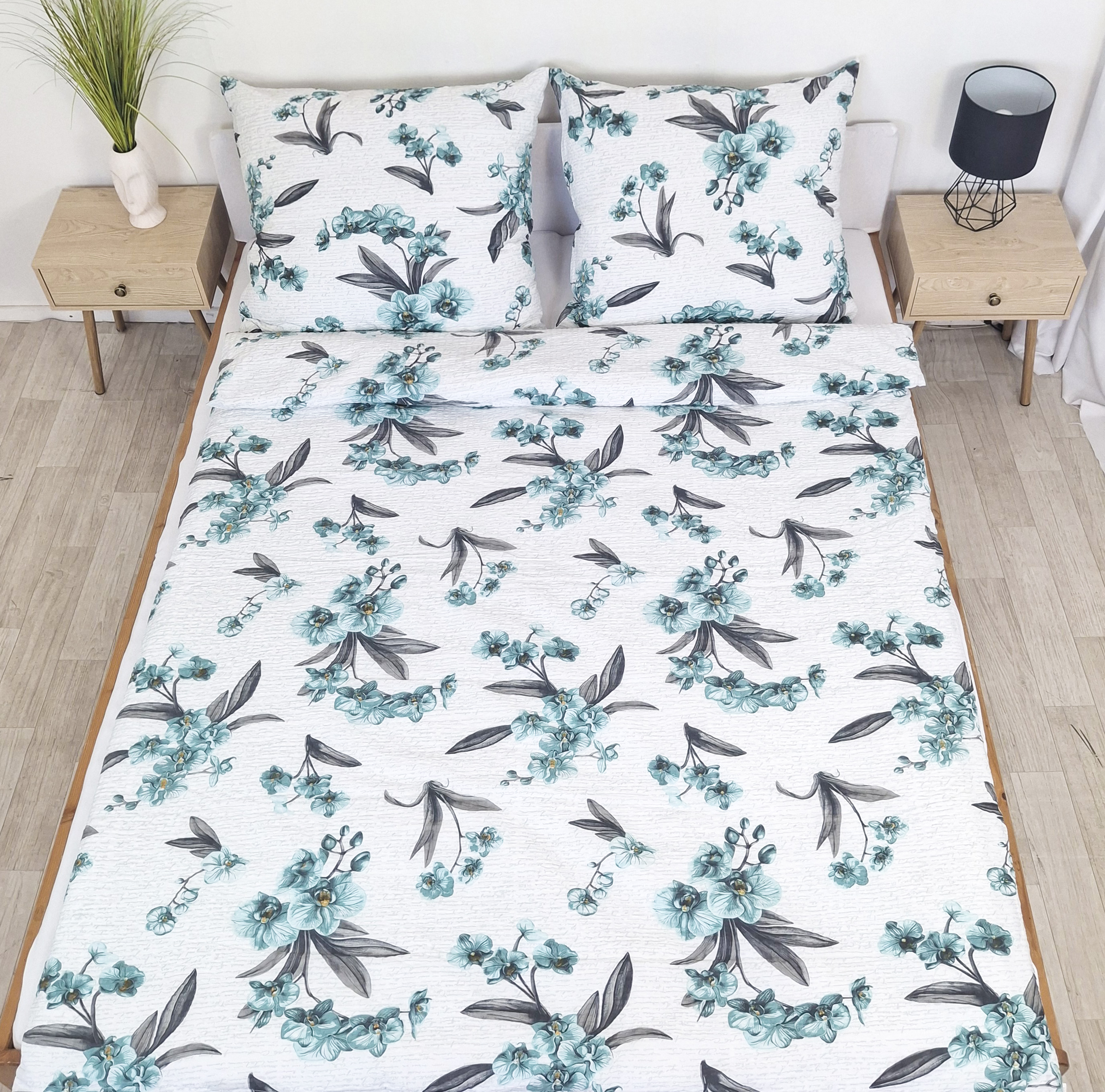 Pościel z Kory PREMIUM Lilia Wytrzymała- Niebieskie Storczyki na Bieli 1363, rozłożone na łóżku