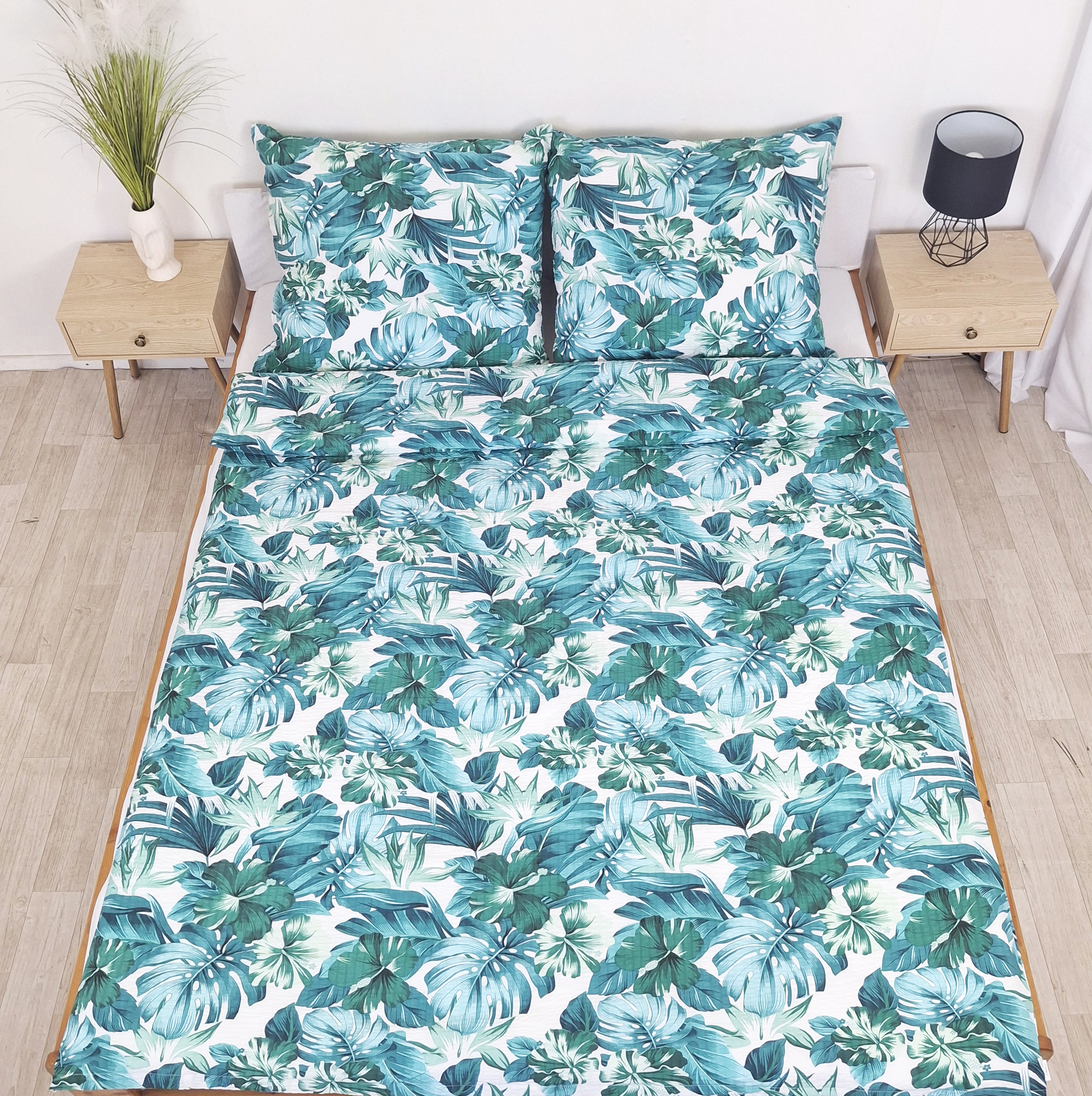 Pościel z Kory PREMIUM Lilia Wytrzymała- Niebiesko-zielona dżungla na białym 1306, rozłożona na łóżku