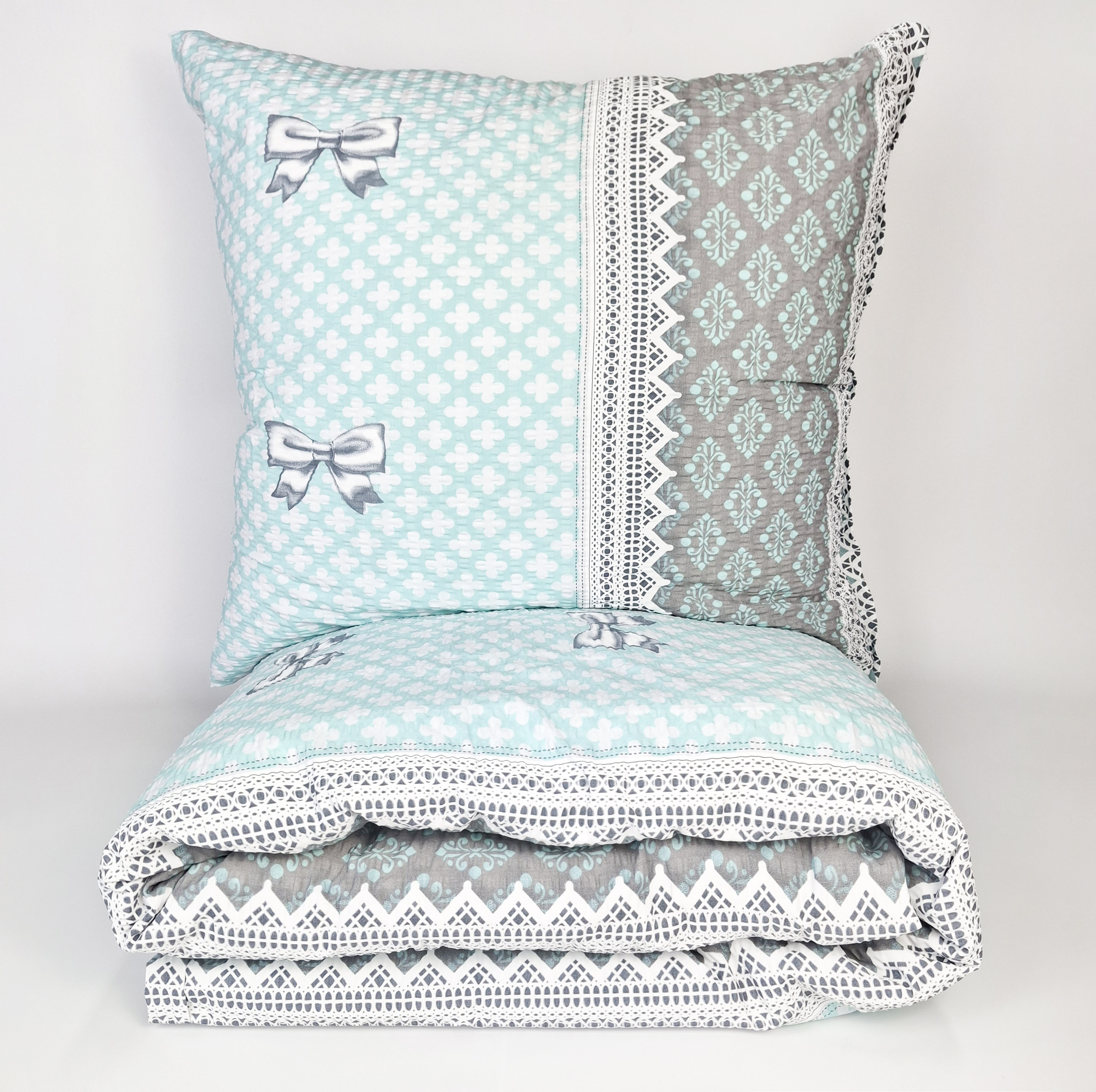 Pościel z Kory PREMIUM Lilia Wytrzymała- Turkusowe kokardki  1077, poduszka i kołdra ubrana w pościel
