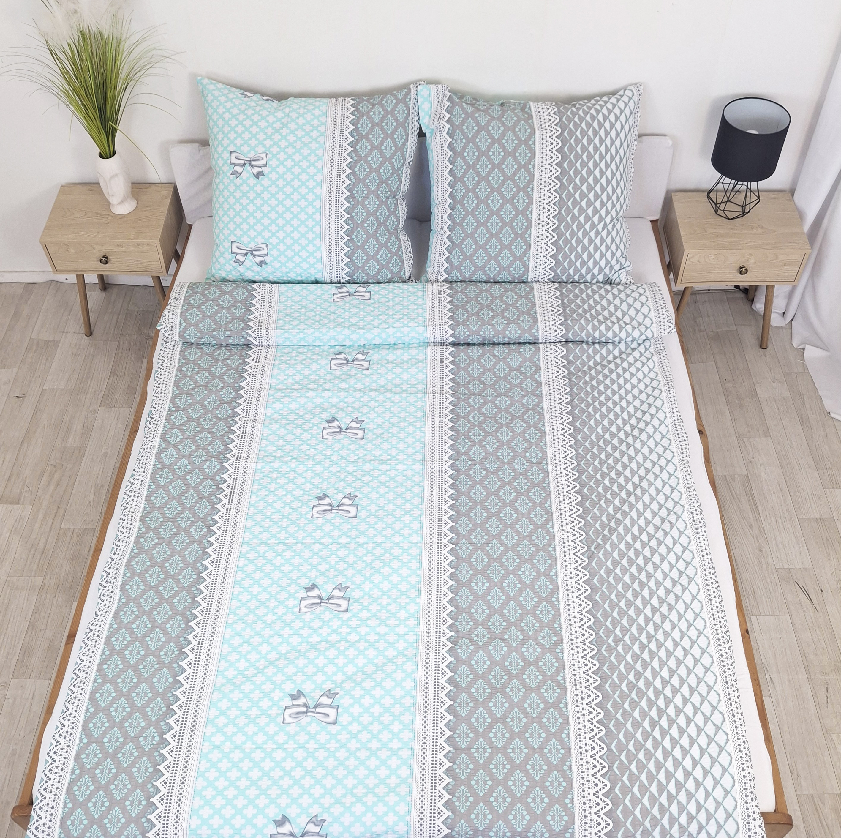 Pościel z Kory PREMIUM Lilia Wytrzymała- Turkusowe kokardki 1077, rozłożona na łóżku