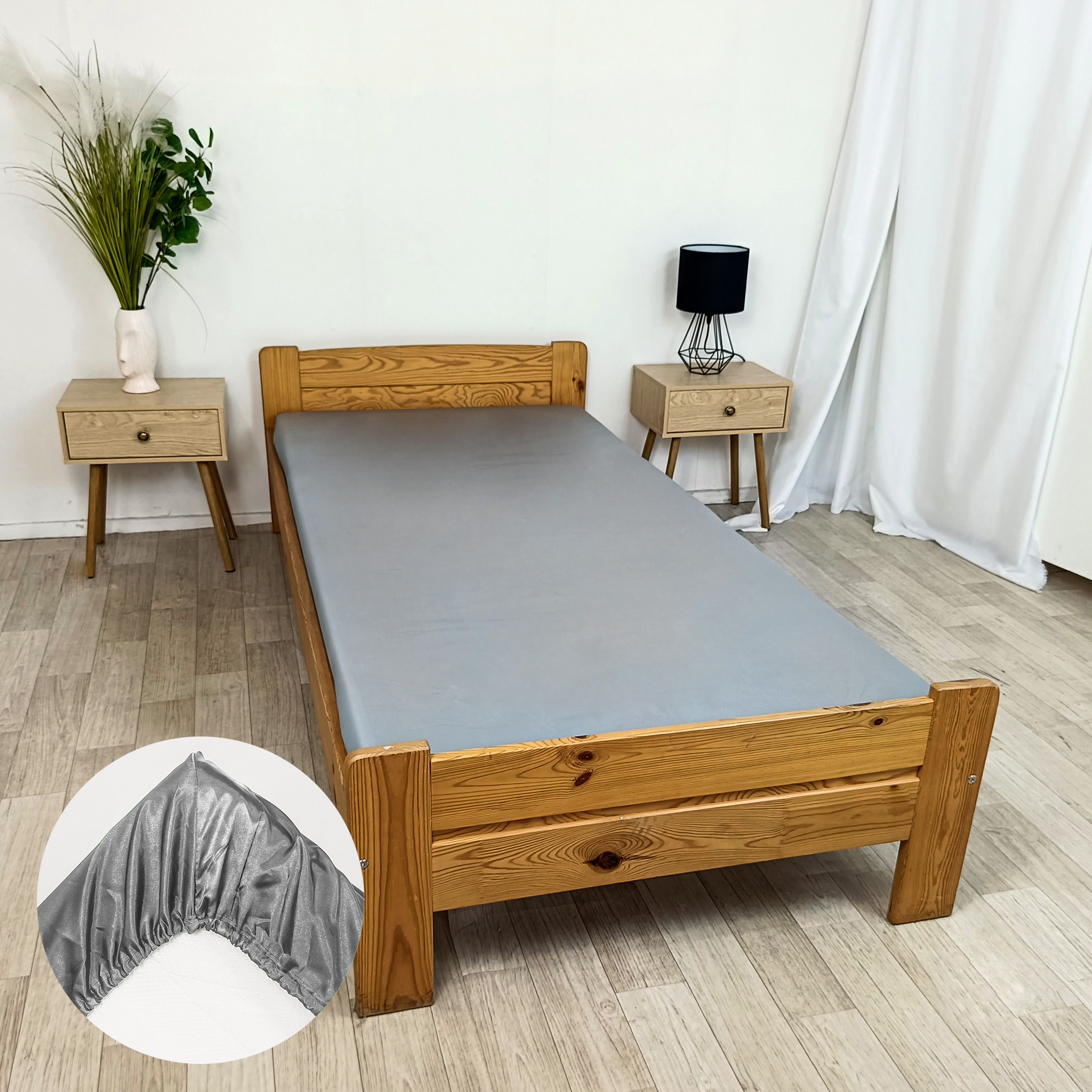 Prześcieradło Satynowe 90 z gumką- srebro rozłożone na łóżku w rogu zbliżenie prześcieradła naciągniętego na róg materaca