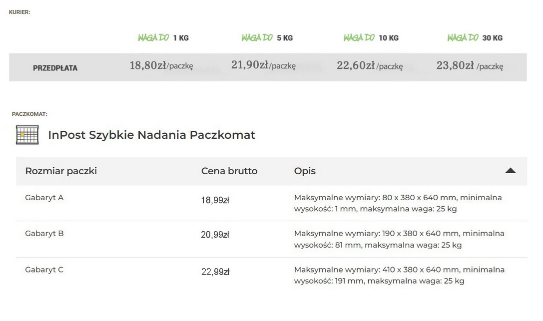 -> Paczkomat - Skompletowane zamówienia są wysyłane za pośrednictwem paczkomatów Inpost. Przesyłkę można monitorować na stronie Inpost- e-mail z numerem przesyłki zostaje wysłany wraz z statusem "towary wysłane". Przesyłki są dobrze zapakowane i ubezpieczone.